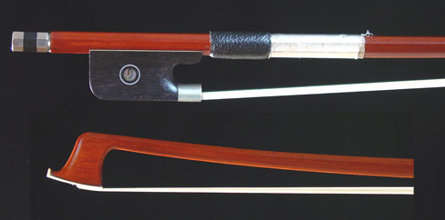 The octagonal stick of reddish brown color, the ebony frog with pearl eyes. The bow is flexible stick of medium weight. Nickel-mounted ebony frog with parisian eye, three-part button and wire grip. |