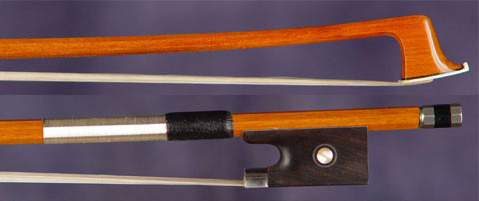 The octagonal stick of reddish brown color, the ebony frog with pearl eyes. The bow is flexible stick of medium weight. Nickel-mounted ebony frog with parisian eye, three-part button and wire grip. |