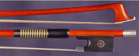 The octagonal stick of reddish brown color, the ebony frog with parisian eyes. The bow is flexible stick of medium weight. Silver-mounted ebony frog with three-part button and wire grip. |