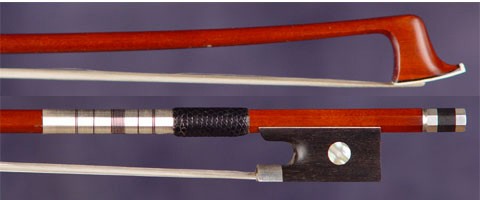 The round stick of dark red brown color, the ebony frog with pearl eyes. The bow is flexible stick of medium weight. Silver-mounted ebony frog with three-part button and wire grip. |
